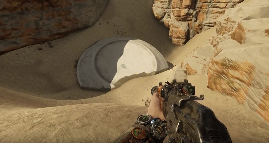 Если на границе Каспия подойти к большому кораблю, расположенному прямо посреди пустыни и отправиться в сторону от него прямо к скалам, при определенной сноровке геймер сможет взобраться на них. Оказавшись за ними, он сразу увидит белую летающую тарелку, которая потерпела крушение в данных горах.