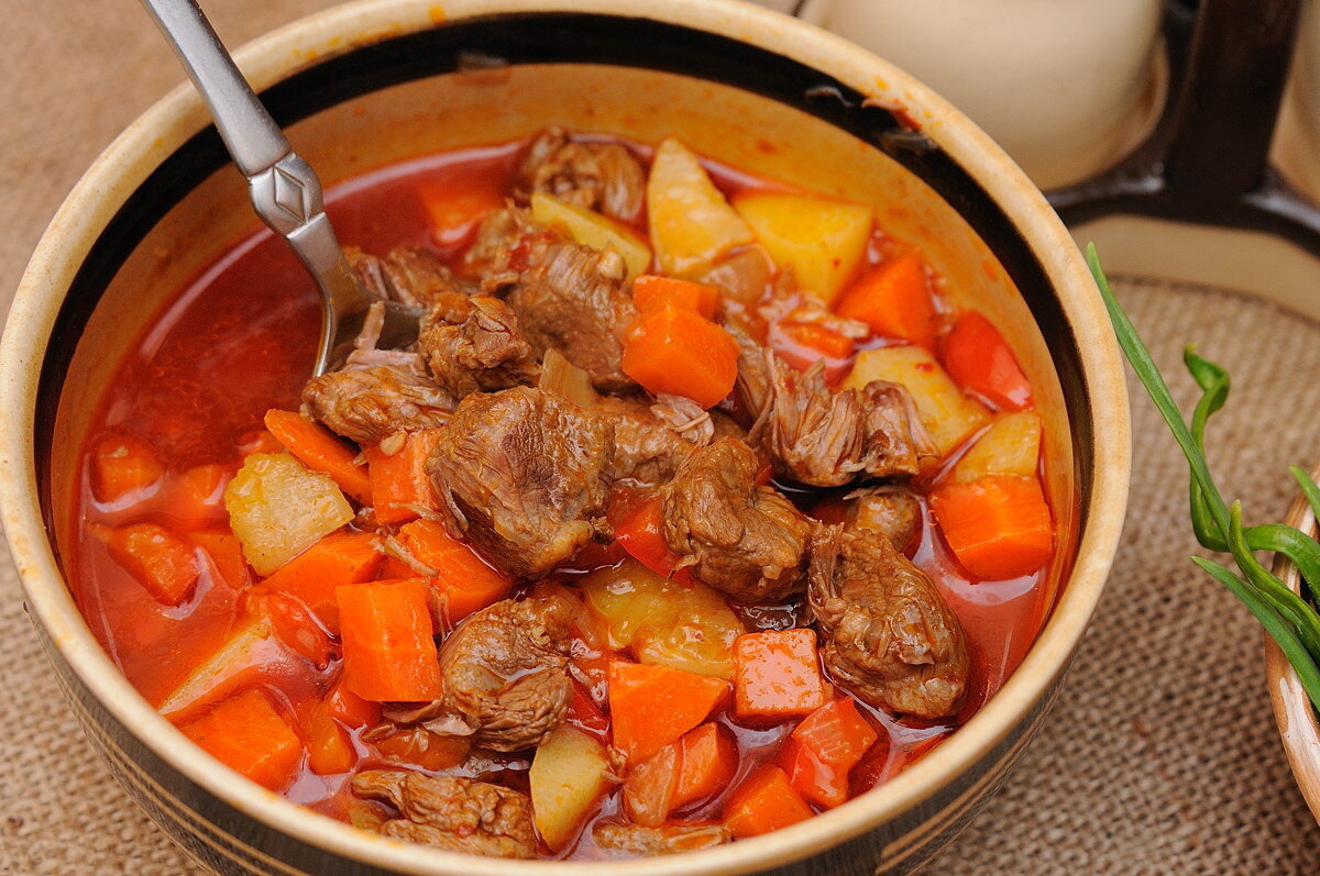 Самое известное в мире венгерское традиционное блюдо. Кстати, слово "gulyas" переводят совершенно неправильно, так как венгерская буква "ly" произносится как "йэ", и правильнее было бы переводить как "гуйяш". Но так уж сложилось повсеместно.