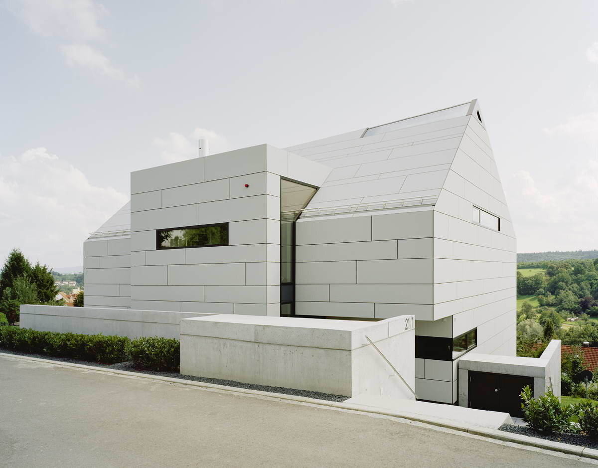 Расположение этого дома характеризуется беспрепятственным видом на Швабские Альпы, который включает в себя средневековый монастырь, расположенный в центре деревни. Сам дом расположен на склоне у дороги и имеет три уровня, включая цокольный этаж. Кроме того, прямо над домом находится зона посадки расположенного недалеко аэропорта, вследствие чего одним из основных требований было обеспечение хорошей звукоизоляции. Для борьбы с шумом в конструкцию была включена бетонная скатная крыша, которая помогла бы отклонить и не пропускать звук летающих над головой самолетов. Озабоченность архитекторов заключалась в том, чтобы попытаться обойти местный регламент в отношении крыши, в котором прописаны цвета: черепичная крыша должна быть либо красной, либо серой. Результатом является уникальная концепция, в которой дом равномерно покрыт светло-серыми, почти белыми панелями из волокнистого цемента «Eternit Pictura», расположенными в том числе и над бетонной крышей. Эта «обертка» дома в едином матери