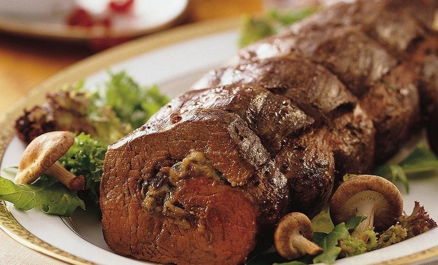 Телятину слегка натри солью и перцем. Вдоль куска мяса сделай глубокий надрез и помести внутрь овощную начинку.