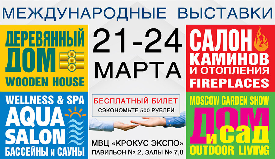 21 марта 2019 года начнут свою работу весенние выставки «Деревянный дом», «Салон каминов и отопления», «Аква Салон» и «Дом и сад». Получите билет на выставку >> Выставки с 21 по 24 марта в МВЦ «Крокус Экспо» это: • 4-в-1: деревянный дом+сад+бассейн+камин;