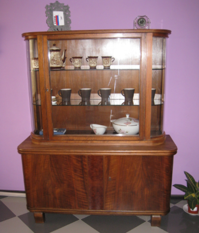 Верхняя часть изделия съемная, две стеклянные полки, лаконичные обтекаемые формы. До сих пор такую стенку можно приобрести по частному объявлению. Только сейчас она будет стоить копейки, даже та, что дошла с 1930-х годов в отличном состоянии.