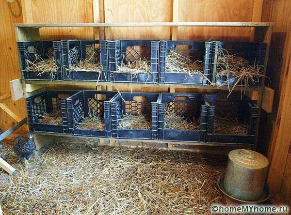 Для создания насеста используйте квадратные бруски или прямые ветки от деревьев толщиной 4–7 см. Не применяйте для них круглые или шлифованные бруски – на них птицам сложно удержаться из-за чего они будут плохо спать. Это негативно повлияет на их общее состояние и яйценоскость. Для изготовления гнезд можно использовать любые деревянные ящики размерами 30х30х40 см (ширина, высота, глубина).