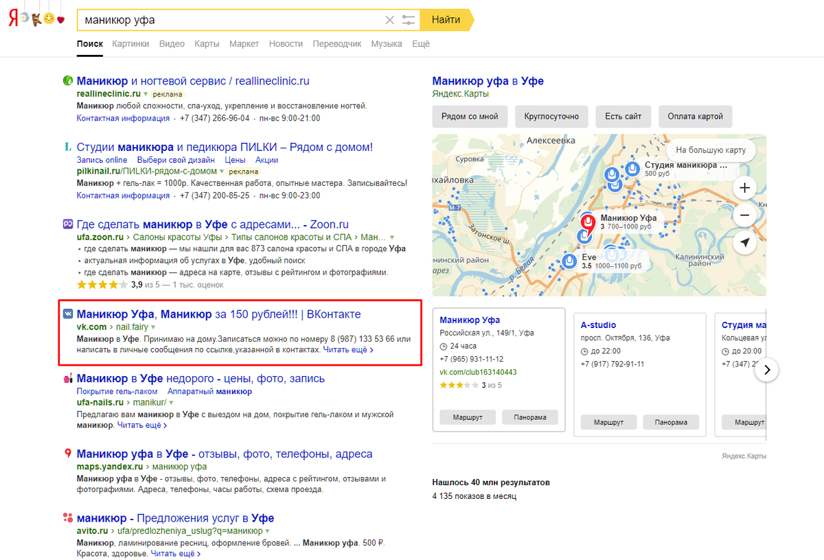 Если вы круто оформите группу с полезным контентом, наберете подписчиков (предлагайте вступать за скидки/бонусы) и будете периодически выкладывать полезный контент, сообщения об услугах и акциях, то со временем у вас будет шанс попасть в ТОП-10 по очень даже частотным запросам.