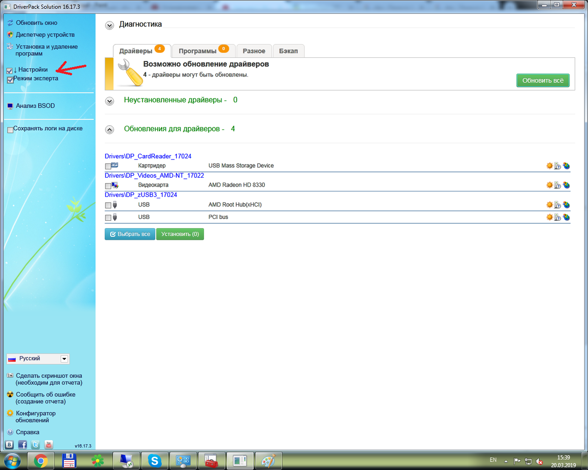 Для того чтобы не искать и не выкачивать драйвера с официального сайта, под ту или иную модель компьютера/ноутбука можно воспользоваться бесплатной утилитой Driver Pack Solution, офлайн версию ее можно скачать по ссылке ---> тут. Сразу после запуска нужно перейти в режим эксперта: Вкладка Драйверы: Далее по пунктам: 1 - Драйвера которые не установлены в системе. 2 - Драйверы которые установлены, но для которых есть более новые версии. 3 - Пиктограмма солнышка, при нажатии на нее, установится только этот драйвер. Кнопкой обновить все, обновит все драйверы в системе, если есть неустановленные, то кнопка поучит название "Установить и обновить все" при нажатии на нее, она установит и обновит все драйверы системы. Вкладка программы: Содержит пак програм для комфортного начала использования системы: Вкладка разное: Содержит драйвера, которых нет в сборнике, но о ИД которых можно получить справку в интернете. Вкладка Бэкап: В этой вкладке есть возможность создать бэкап драйверов для данного