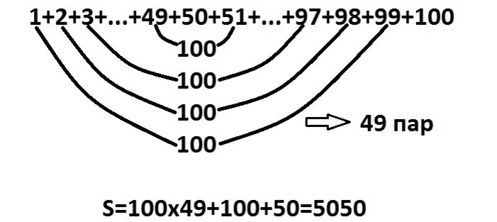 Карл обратил внимание, что числа от 1 до 100 можно разбить на пары: 1 и 99, 2 и 98, 3 и 97, и т. д. Последняя пара - это 49 и 51. Таких пар получилось 49. Сумма каждой пары составляет 100. После разбивки на пары осталось два числа: 100 и 50. Теперь легко сосчитать: 49 пар по 100 - это 49х100=4900; плюс ещё 100 - это 5000; плюс 50 - это 5050.