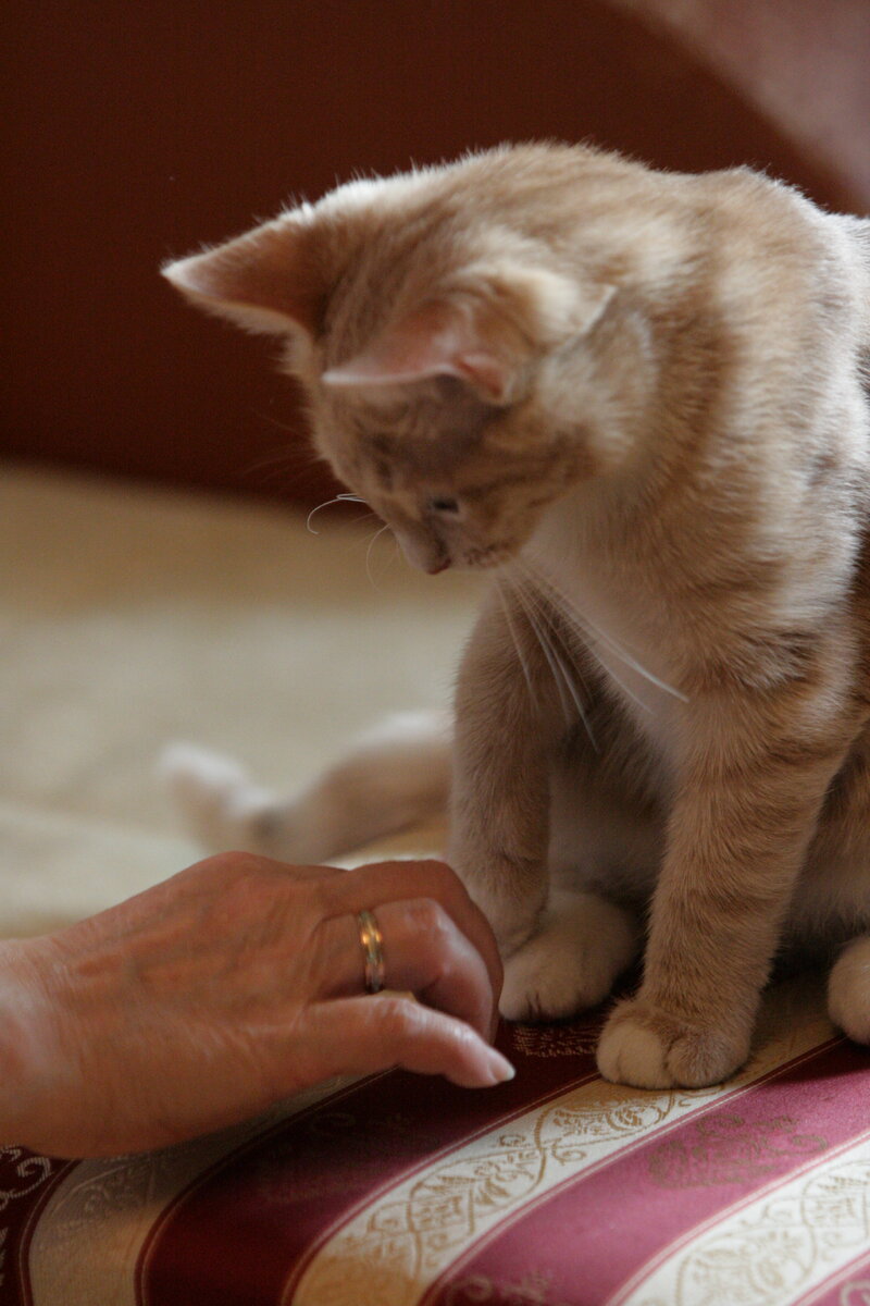 В кошачьем мире, кошки приближаются друг к другу и нюхаются носами, чтобы определить, знакомы ли они между собой. Если вы держите палец на той же высоте, как и нос кошки, ваш палец становиться как бы суррогатным кошачьим носом. Когда вы держите палец на месте и не двигаете в сторону кота, вы даете ему возможность самостоятельно решить приближаться к вам или нет. Давая кошке выбор, вы сразу уменьшаете ее уровень стресса.