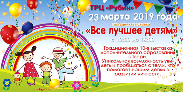23 марта 2019 года в дни весенних каникул с 12.00 до 16.00 в «ТРЦ Рубин» города Твери АНО ДПО «Современная Школа Знаний» совместно с Детским технопарком «Кванториум» организует выставку-праздник дополнительного образования «Все лучшее детям» спорт, учеба и развлечение при поддержке Министерства Образования Тверской области, Администрации города Твери, Депутаты городской Думы, Госавтоинспекция по Тверской области и учреждениями дошкольного и детского образования. Цель выставки - помочь правильно организовать детский досуг, чтоб каждый ребенок мог выбрать себе занятия на учебный год и на летний период. В одном месте собираются коллективы домов культуры, музыкальные и спортивные школы, летние лагеря, творческие студии, секции, языковые центры, танцевальные клубы, больше 50 организаций. Выставка состоится 10-й раз! Проходит она 2 раза в год: в начале сентября и в конце марта. Сентябрьскую выставку посетили более 3 000 человек, не считая гостей торгового центра. В центральной части ТРЦ «