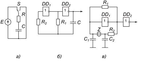 Временную задержку также можно получить если подсчитывать импульсы от RC-генератора (частота которого определяется также постоянной времени конденсатора и резистора – Рис.1, б) или от кварцевого генератора (Рис. 1, в). Использования кварцевого генератора предпочтительной по причине высокой стабильности частоты выходного сигнала.