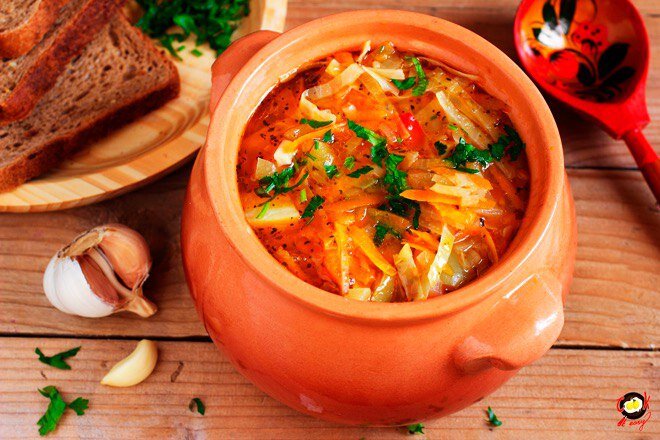 Щи – истинно русский суп. Его варят со свежей капустой или с квашеной, со щавелем или с крапивой. Щи согревают зимой, холодные выручают жарким летом. Самые вкусные щи – суточные, наваристые и выдержанные. Набор ингредиентов: Рецепт приготовления суточных щи в горшочках: Опустить мясо, луковицу, морковь, корень сельдерея или петрушки в воду и после начала интенсивного кипения убавить огонь. Варить 1 час. Кстати, чтобы бульон получился прозрачным, не стоит допускать его интенсивного и долгого кипения. Вынуть продукты из бульона. Мясо, снять с костей, мелко нарезать, бульон отфильтровать. Очищенные картошку, лук, морковь и помидор нарезать кубиками, капусту нашинковать. Картофель положить в бульон, варить 5 минут при среднем кипении. Положить свежую капусту, спустя минуту квашеную. Лук, морковь и помидор пассеровать в масле. Нарезать по паре веточек огородной зелени: укропа, петрушки, сельдерея. Вместе с мясом положить в суп. Сдобрить солью, поперчить. Разлить щи по горшочкам, закрыть и