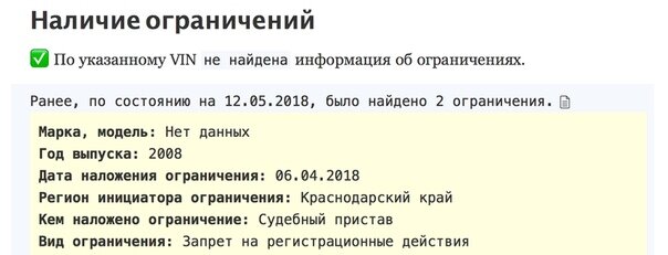Проверить пробег, историю владения, наличие ДТП — это основные, но самые поверхностные данные, которые может выдать AVinfoBot. Но есть еще кое-что полезное, что может дать бесценную информацию о прошлом автомобиля. И История ограничений, наложенных на автомобиль Ограничения накладываются на автомобиль различными государственными органами для того, чтобы побудить владельца устранить какие-либо нарушения, либо выполнить взятые на себя обязательства. Причин может быть множество. Некоторые устраняются довольно просто, а некоторые — не устраняются вовсе. В любом случае, покупка автомобиля с наложенным ограничением на регистрационные действия крайне нежелательна и может совершаться только про полном понимании покупателем, что он будет делать с этим дальше. Для того, чтобы максимально проинформировать покупателя об истории автомобиля в «Полный отчёт AVinfo» добавлена функция истории ограничений. В отчёте можно увидеть не только имеющиеся ограничения, но и те, которые уже сня
