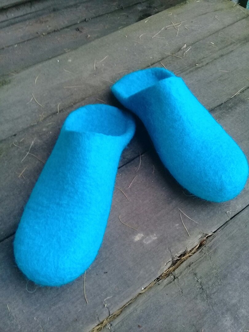 И еще одни. Тапки. Новые. Смотрю на них и понимаю, что уже с легкостью могу сделать раскладку за час и все остальное еще за час. И еще минут сорок на подошву отвести. Получается, три пары за рабочий день. Не плохо же, да? Скучно. Хочу набрать людей в онлайне или очно, готовых научиться валять тапочки из шерсти и обучить их этому ремеслу бесплатно. Пусть кому-то это поможет в жизни.