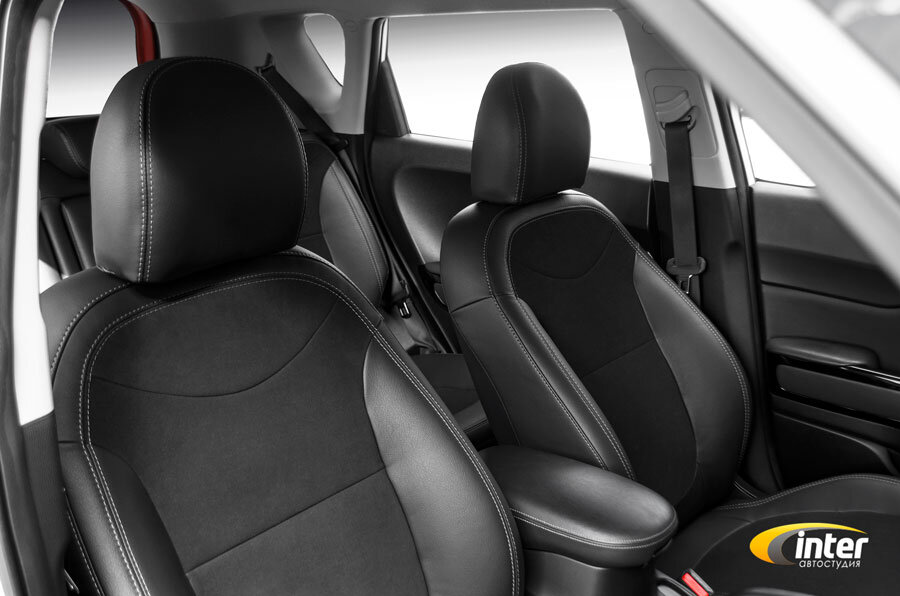 Всем доброго дня! Установили каркасные чехлы на KIA Soul II. Материал — искусственная кожа Флекси. Центральная часть — из оригинальной Алькантары. Дизайн заводской. Отстрочка серой нитью.