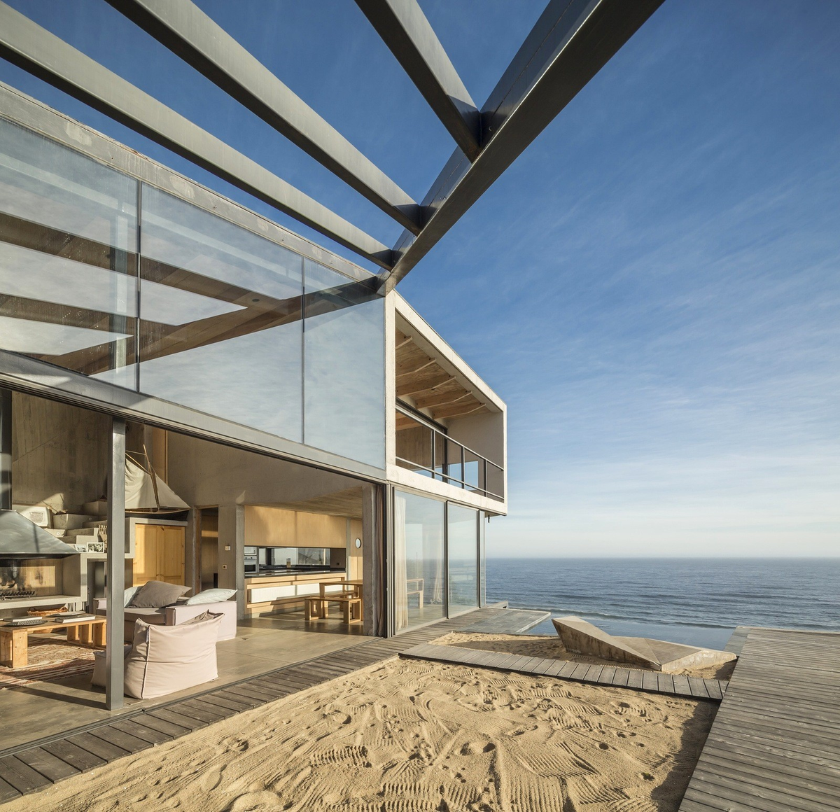 Проектное бюро Schmidt Arquitectos Asociados представило дом на берегу океана для семейной пары со взрослыми детьми, расположенный в посёлке Качагуа, Чили. Он построен на пологом участке с великолепными видами и закатами, но подвергается воздействию холодного юго-западного ветра. Резиденция площадью 320 квадратных метров максимально использует окружающий ландшафт, а её просторный интерьер создан из чистых и простых материалов. Заказчики стремились к традиционному образу жизни в пляжном доме с абсолютной свободой и интеграцией пространств, с отрывом от жёстких формальностей городских резиденций, со спокойной и расслабленной атмосферой. Архитекторы предложили пляжную террасу, которая выходит на океан, является местом созерцания и интегрирована в основной объём гостиной, столовой и кухни через большое окно. Чтобы поддержать идею релаксации вместо укладки твёрдого пола на террасу насыпали песок, по которому можно ходить босиком. Единственный твёрдый материал, деревянный настил, использовал
