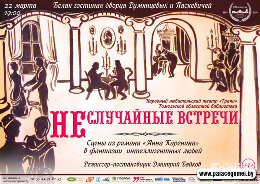 Окунуться в атмосферу домашних спектаклей предлагает народный любительский театр «Грачи» областной библиотеки. В Белой гостиной дворца Румянцевых и Паскевичей актёры сыграют спектакль «Неслучайные встречи. Сцены из романа «Анна Каренина» в фантазии интеллигентных людей». Чтобы зрители прониклись атмосферой XIX – XX веков, в стоимость билета включили посещение выставки коллекционера Сергея Путилина «Шерше ля фам».