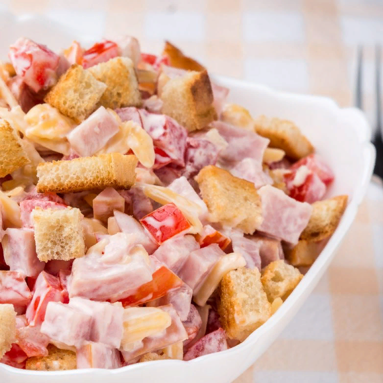 Салат с колбасой, сыром и сухариками. Это быстрый салат, его действительно можно сделать за 5 минут. Количество ингредиентов можно менять по своему вкусу. Продукты (на 2 порции) Колбаса салями - пол палочки Сыр - 200 г Помидор- 1 шт ( можно добавить больше, по вашему вкусу) Сухарики (кириешки с беконом) - 1 упаковка Майонез для заправки - по вкусу Приступаем к приготовлению: Нарезаем колбасу, сыр и помидор ломтиками/кубиками. Складываем все в миску, добавляем сухарики, заправляем все майонезом, и салатик с сухариками готов! Приятного Вам аппетита!