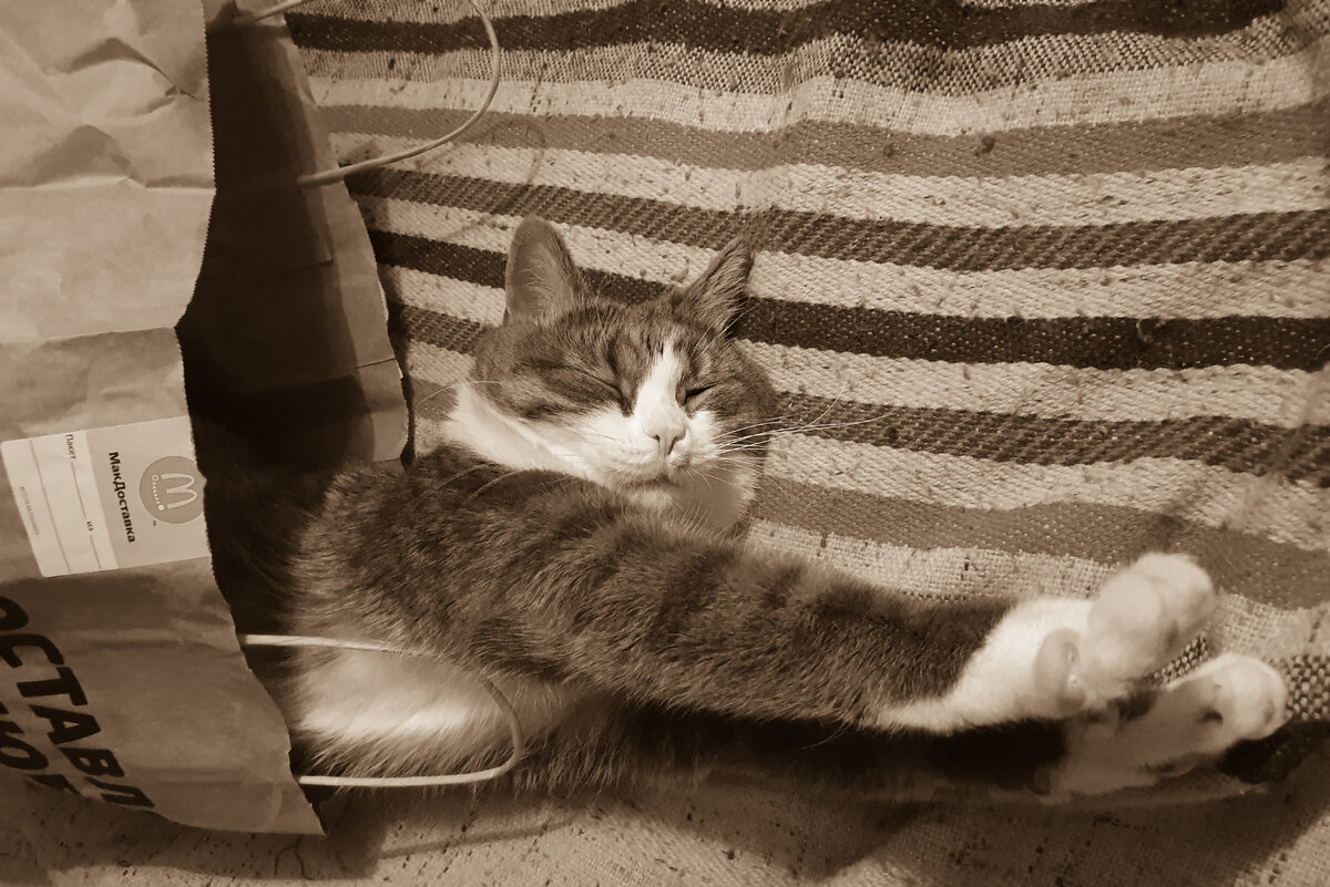 Всем привет. Сам для себя не могу объяснить свою любовь ко всяким громко шуршащим пакетам. Но, прямо усы поддерживаются от удовольствия, когда удается у хозяина выпросить очередной шуршащий мешочек. Сегодня был один из таких дней, ну почти... Вообще, не очень красиво с его стороны получилось - этот "хомяк" заказал себе в Макдоналдсе еду! И что вы думаете он взял для своего любимого и обожаемого кота? Да ничего! Вот вообще ни кро ше чки! А сам сидел дома в кресле и уплетал такую ароматную и вкусную курочку! Я, безусловно, попробовал отобрать у него свою долю! На что получил нелепейший ответ, мол - ты же кот! Тебе такое нельзя! Оооой, ну как же она приятно пахла! Я уж и подлизываться пробовал - без результата! Потом я решил, что хоть что-то от этого праздника жизни но должно достаться мне... Пакет, в котором принесли заказ, хозяева бросили на диван, вот его я и решил прихвостизировать. Ну а что, очень кстати прочный, отлично шуршащий пакет! И только я ещё всего одной лапой в