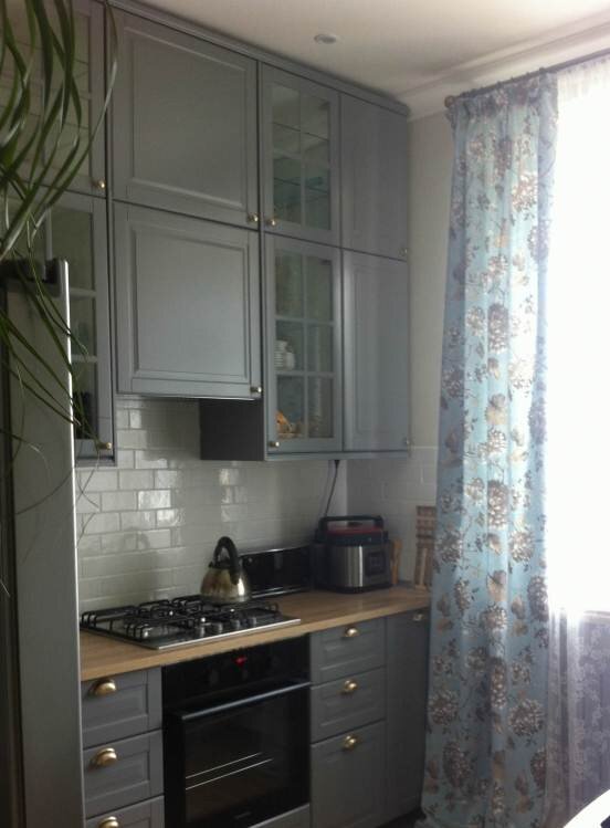 Об одной из самых популярных и красивых кухонь ИКЕА серии "Будбин" рассказывает Людмила. Я давно мечтала о новой кухне. И вот, благодаря Икеа, это свершилось! Кухню собирали с мужем сами. Метраж около 10 кв. м.: стена с окном 3,3 м., стена со столом 3,15 м. Техника частично покупалась в Икеа – вытяжка и микроволновка, частично – не Икеа, покупалась раньше. Фасады "Будбин" - не самые дешевые, но и не самые дорогие. Кухня Людмилы стоит 204 тысяч рублей (без учёта техники). Стулья для обеденной зоны (серия "Ингольф") тоже куплены в ИКЕА. Обратите внимание, что серый кухонный гарнитур затемняет маленькую кухню, поэтому все остальные элементы интерьера лучше оформить в светлых тонах, как и было сделано. Фартук - плитка "кабанчик" или метро белая. Стены - светлые с бежевым оттенком. Искусственного освещения тоже достаточно много: лампа над обеденной зоной ("Хектар"), точечные, подсветка шкафов-витрин и рабочей зоны. Благодаря шторам кухня стала по-домашнему уютной с нотками кантри. Как