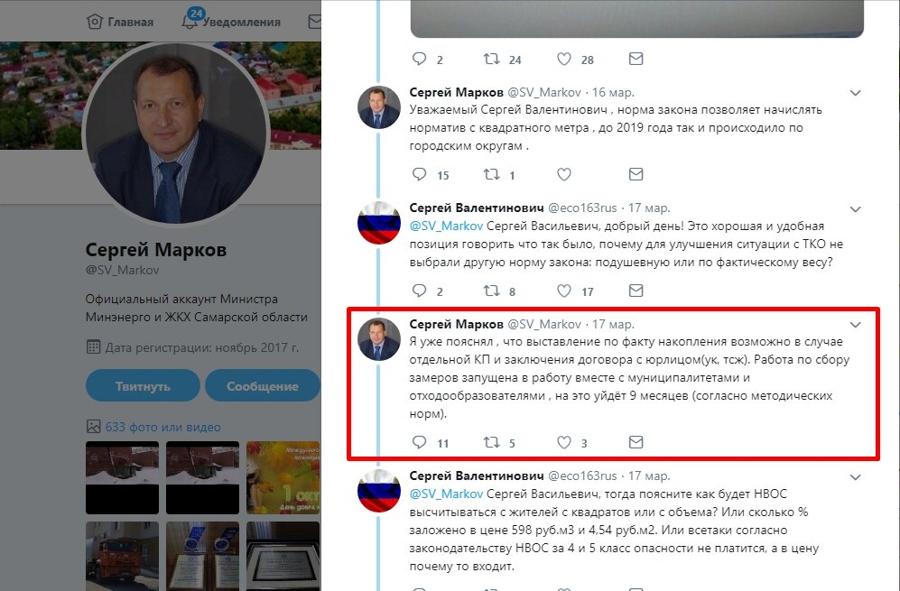 Ну, золотой ведь человек, если конечно не врет. В общем, министр энергетики и ЖКХ Самарской области Сергей Марков сделал очень интересное заявление. Ссылочку на его заявление прилагаю: Сергей Марков Он в Твитере написал, что жители могут платить за вывоз мусора не по нормативу, а по фактическому объему ТКО. Даже объяснил, как легко это организовать: - Нужна отдельная контейнерная площадка; - Договор с региональным оператором заключается от лица управляющей компании, ТСЖ, СНТ (от юридического лица), а не от лица жителей. И всё! Для любого многоквартирного дома переход на такой порядок расчетов никакого труда не должен составлять. Если это не просто комментарий в социальной сети, и министр эти свои слова готов подкрепить делом, я повторюсь - он золотой человек. Полезный, бесценный, хороший - всё про него. Я даже подпишусь на его Твитер Другое дело, если он это просто ляпнул, не подумав... с людьми такое бывает. Есть ведь действующее законодательство, которое говорит несколько обратное. Е