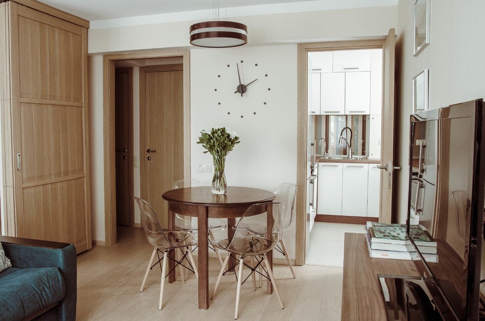 Главные приметы серии домов II-29 – крохотные комнатки, пятиметровая кухня и сидячая ванна. Но грамотная планировка способна не только исправить все эти недостатки, но даже сделать из двух комнат три. Типовой вариант В планировке «от застройщика» плохо всё: кухня всего 5 м², сидячая ванна в санузле, несколько ниш и кладовок непонятного назначения. Да и сами комнаты маленькие – спальня не дотягивает даже до 9 квадратов, а проходная гостиная – около 13 м². Жить в такой планировке, конечно, возможно. Но удобных вариантов для расстановки мебели не остаётся. Вариант 1 Самый очевидный вариант – объединить крошечную кухню с соседней комнатой. Получится вполне комфортное пространство площадью 16 м² с диваном, обеденным столом для двоих и линейным кухонным гарнитуром. Все кладовые демонтируем, зато стену между спальней и прихожей сделаем сложнее по форме, чтобы встроить платяной шкаф и шкаф для верхней одежды. Санузел немного расширили за счёт коридора и перенесли дверь. Это позволило вм