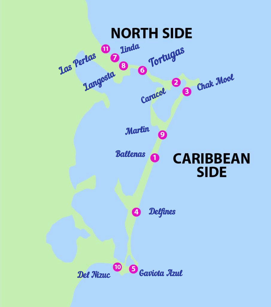 Зона Отельера, где находятся большинство пляжей - это коса в форме семерки. И пляжи, которые расположены на "шляпке" семерки и на ее ножке - значительно отличаются. Карту основных пляжей прикладываю. Те, что расположены на "шляпке" - на севере - они без волн. Рядом расположен остров, который защищает эту сторону от волн. У нас отель находился на пляже Langosta. Море прекрасное. Волн практически нет. И неглубоко - скрывает полностью только у буйков. Для кого-то - это плюс. Детям , например, здесь здорово. Ну, и тем, кто волны не любит. Но кому-то такой "лягушатник" может не понравится. Читала в отзывах, что лучший пляж без волн - Caracol. Подтвердить это не могу - не была. Теперь по поводу пляжей с волнами. Самый лучший пляж по всем отзывам - Плайя Дельфинес. Впечатляет. Буйство океана и прибрежная полоса, уходящая вдаль. Но,конечно, волны сильные. При нас люди купались, но с ног чуть ли не сшибало даже нас, идущих по кромке воды. Это общественный пляж. Здесь есть бесплатные грибки-зон