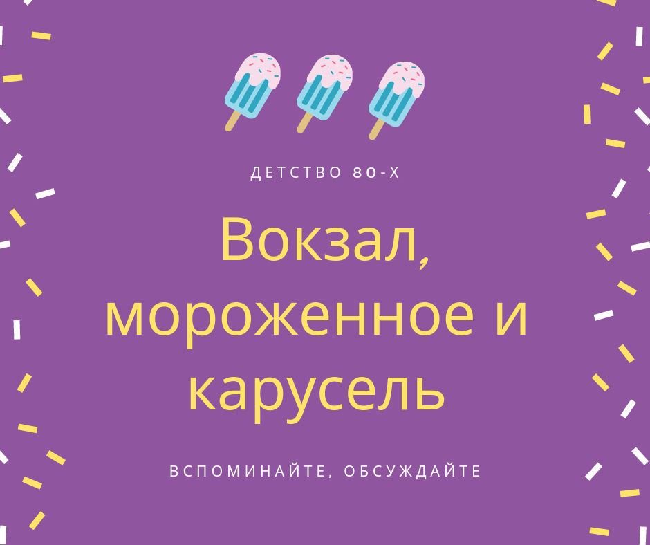 Почему-то когда я вспоминаю самое раннее детство перед глазами встают некоторые основные картинки из прошлого. Например когда мне говорят мороженное я сразу представляю бумажные стаканчики с бумажкой сверху до жути неудобные палочки для еды этого мороженного, кусок сухого льда на тележке мороженщицы. Мы все наверное отдыхали летом на дачах, а добирались на электричках. У более менее крупных поселков-городков при станции всегда была вокзальная площадь и карусель на которой играла детская музыка "Антошка, Антошка пойдем копать картошку " неслось из громкоговорителей пока ты несся по кругу. Такое вкусное мороженное сливочное или пломбир, сейчас такое почти невозможно найти. Универмаги и универсамы, игрушечные магазины, опилочные раскидайчики. Вспоминайте, комментируйте ведь это наше с Вами детство! ,