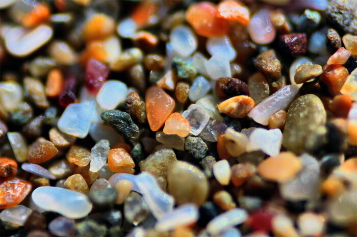 Редко встречается красная окраска (например, вулканические пески с соответствующими цветными горными породами) или зеленые (включающие хризолит, хлорит-глауконит). Бывают черные, имеющие в своём составе минералы магнетит или гематит, а также лиловые пески, оранжевые и многоцветные. На фото представлен разноцветный песок, вид сверху показывает непривычный для российской природы пейзаж.