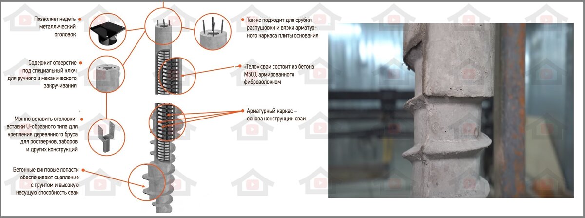 Что собой представляет ЖБВС · Диаметр сваи 152 мм. · Лопасть многовитковая, что обеспечивает более надежное фиксирование в грунте. · Внутри сваи есть закладная, необходима для удобного закручивания в грунт. · Вокруг закладной витками уложена арматура диаметром 8 мм. · Изготовлена свая из бетона марки М 500. · Вдоль корпуса установлены 4 арматуры по 6 мм. · В состав бетона входят гидрофобные присадки. · Минимальная длина такой сваи 2,7 метра. · Срок службы более 80 лет. Монтаж 1. В условиях зимнего монтаж производится небольшая подкопка на глубину 30 – 40 см. В теплое время это делать не обязательно. 2. Выполняется первое бурение шнеком 80 мм на глубину 1,5 м 3. Закручивание ЖБС в грунт с помощью ключа, который вставляется в закладную трубу. Во время работ контролируется вертикальное положение. 4. После установки уплотняется грунт вокруг сваи, чтобы он не просел во время весеннего потепления. 5. По размеру обрезается часть сваи. 6. Для исключения коррозии закладного элемента
