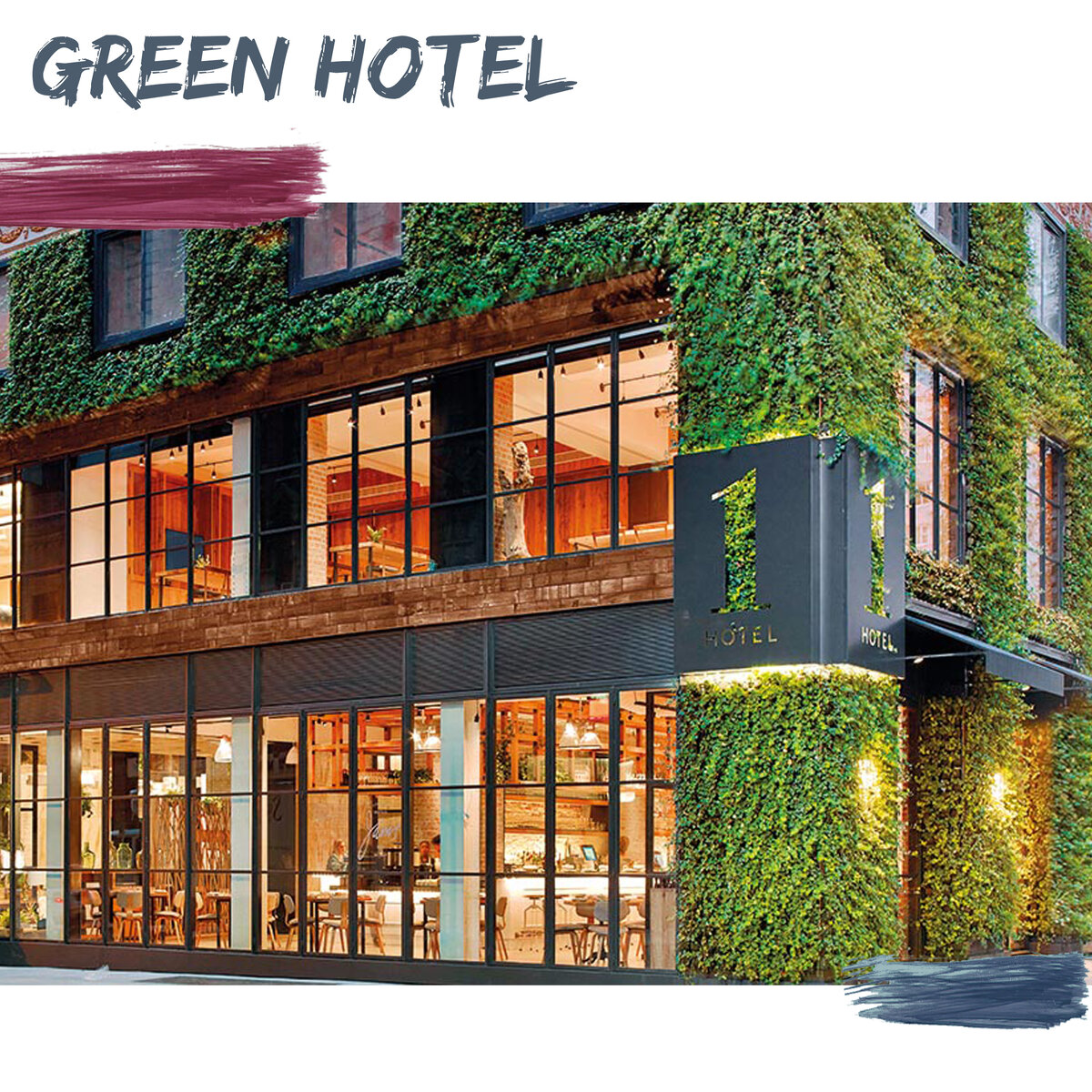 Если вы случайно купите билет на самолет в Воронеж, рейс перепутают и высадят вас в Нью-Йорке, не печальтесь. Вы сможете комфортно переночевать в одном из самых экологичных отелей планеты «1 Hotel Central Park». Здесь все кричит об эко-стиле, начиная от вьющихся растений на фасаде до маленьких камешков на ручке номера с надписью «Не беспокоить». Снаружи вас встречает ковер из английского плюща. Выбор данного растения – не только стильное решение фасада здания. Плющ относится к вечнозеленым культурам, а особую популярность в дизайне и архитектуре получил благодаря своей практичности. Так, например, проведенные исследования ученых из штата Огайо выявили, что плющ крайне тяжело отрывается от поверхностей стен в связи со своими природными свойствами, которые позволяют заполнить мельчайшие трещины поверхности здания. Внутри – вертикальные сады, большие композиции из горшков с растениями и кашпо из мха. Растения используются не только как дизайнерское решение, но и по прямому назначению