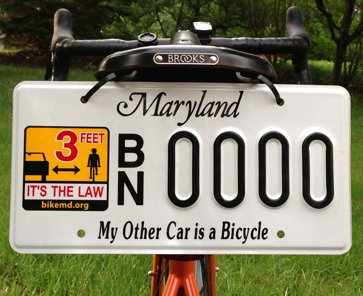 На фото вверху: декоративный “номерной знак”, выдаваемый велосообществом американского штата Мэриленд своим членам. Знак используется еще и как напоминание водителям о необходимости держать дистанцию при обгоне.
