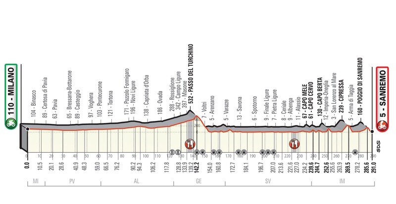 Милан - Сан-Ремо является самой длинной однодневкой сезона, протяженность ее маршрута - 291 километр. В этом году гонка пройдет по своему классическому маршруту с шестью подъемами: Passo del Turchino в середине дистанции, затем три небольших "Capo", расположенные за 40-55 километров до финиша, а также Cipressa и Poggio, о которых стоит рассказать чуть подробнее.