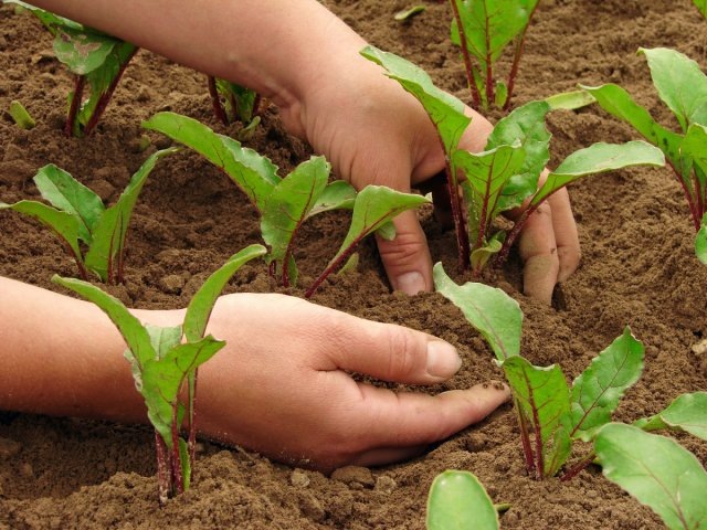 Первое прореживание. Через 5-10 дней после появления всходов у свеклы появляются 2 новых листка. В это время нужно избавить грядку от слабых сеянцев. Сначала землю обильно поливают, а затем выдергивают 1-5 слабых ростков, оставляя 2 самых крепких. Ямки засыпают землей и уплотняют.