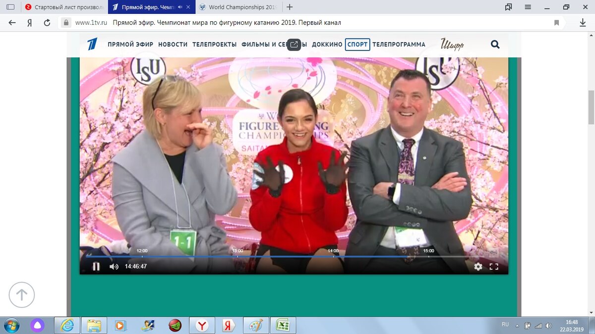 Кричала Татьяна Анатольевна Тарасова из комментаторской кабины. Евгения Медведева на Чемпионате мира в Япониии получила по сумме двух программ 223,8 балла, опередила Рику Кихиру и на данный момент держит промежуточное первое место! Жена идеально откатала произвольную программу, без помарок, хотя на разминке выглядела чуть-чуть "тяжелой". Но она показала всем свой спортивный характер, она сделала это! Доказала прежде всего самой себе, что не зря все усилия, не зря - трудный сезон и переход в другой тренерский штаб. Я безумно рада за Женю! Как бы ни сложились соревнования в дальнейшем, она - уже победитель для меня! Говорят, Женя повредила бедро, но даже с травмой катается идеально! Она сделала сложные каскады, каскад сальхов-риттбергер... "С возвращением, Женька!" - кричала Татьяна Тарасова. Трибуны взорвались! Тренер Брайан Орсер чуть не плакал от счастья!