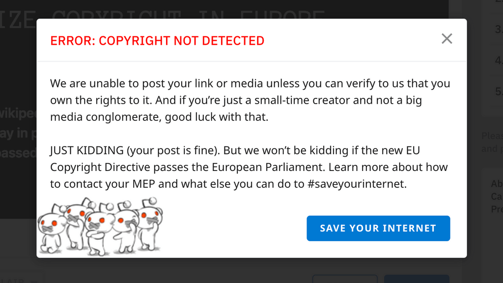Reddit, Wikipedia и PornHub выступают против нового законодательства ЕС об авторском праве, голосование по которому должно состояться на следующей неделе. Wikipedia отключила сайт в некоторых странах ЕС, а Reddit и Pornhub показывают баннеры, в которых призывают пользователей повлиять на политиков, пишет Business Insider. Европарламент должен принять решение по поводу закона 26 марта. Сайты высказываются против его 13 статьи, согласно которой технологические компании будут должны выявлять контент, нарушающий авторское право, на своих платформах. В знак протеста Reddit выводит сообщение об ошибке со словами «copyright not detected», когда пользователи из ЕС пытаются создать пост. Окно можно скрыть — Reddit лишь хочет дать прочувствовать, какие изменения ждут его сообщество с принятием закона. Баннер с протестом разместил и PornHub. Wikipedia на 24 часа отключила сайт в Германии, Чехии, Словакии и Дании. Пользователей перенаправляют на страницу, выступающую против 13 статьи предлагаемых