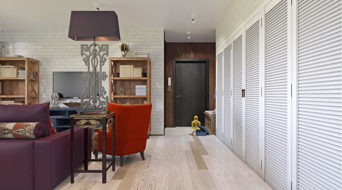 Специалистами нашей дизайн-студией разработан дизайн интерьера трехкомнатной квартиры на ул. Кравченко, в г. Москва, общая площадь помещения 80 кв. м. Хозяйка квартиры — молодая девушка, владелица салона красоты, которая увлекается историей искусств, путешествиями и фэнтези. Чтобы удовлетворить всем требованиям заказчика, и сделать интерьер по настоящему индивидуальным и необычным, мы решили разработать дизайн интерьера в стиле эклектика, добавив в него винтаж с этникой. Мы постарались реализовать современный дизайн московской квартиры, который объединяет высокий индивидуализм и творческую атмосферу, учтя все пожелания заказчика. Проект предлагает сильные цветовые контрасты, сопоставление материалов: беленые ясеневые полы и открытые кирпичные стены, натуральную древесину и мебель в необычных формах, этнический текстурный дизайн и футуристическую инсоляцию, двери как дополнение к мебели, так же используем декоративную штукатурку для создания фактур. Помещение спроектировано с большим