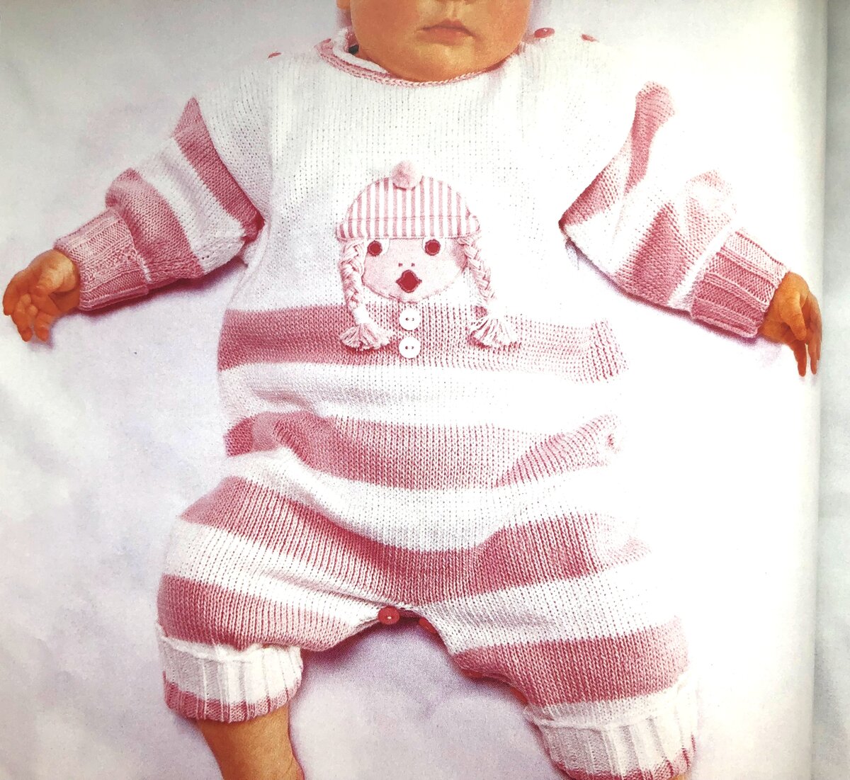 Отличный комбинезон для девочки с аппликацией в виде куклы. Потребуется: Рост 62 — 68 см. Возраст 4 -8 месяцев. Узоры и виды петель Лицевая гладь. Лицевые ряды — все петли лицевыми; изнаночные ряды — все петли изнаночными. Резинка 3 х 2. Лицевые ряды: * 3 лицевых петли, 2 изнаночных петли *, повторять от * до *. Изнаночные ряды вязать по рисунку. Последовательность чередования полос: 4 см нитью белого цвета, 4 см нитью розового цвета. Плотность вязания 10 х 10 см = 28 петель х 35 рядов. Выполнение работы Правая штанина На спицы № 2,5 набрать 90 петель нитью белого цвета, вязать 3 см резинкой 3 х 2 и 4 см резинкой 3 х2 нитью розового цвета. Перенести все петли на спицы № 3,5 и вязать лицевой гладью, соблюдая последовательность чередования полос, до высоты 19 см от начала работы. Оставить петли незакрытыми. Левая штанина. Вязать, как правую штанину. Объединить петли обеих штанин (= 180 петель) и вязать круговыми рядами, соблюдая последовательность чередования полос, до высоты 39 см