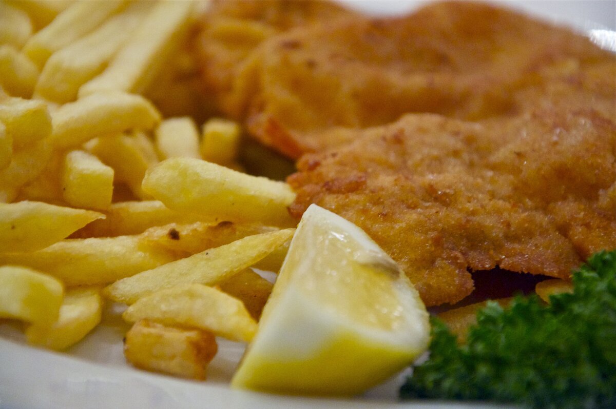 В классическом варианте венский шницель готовится из телятины с классическим же гарниром из жареного соломкой картофеля и зеленого горошка в сопровождении непременного ломтика лимона.