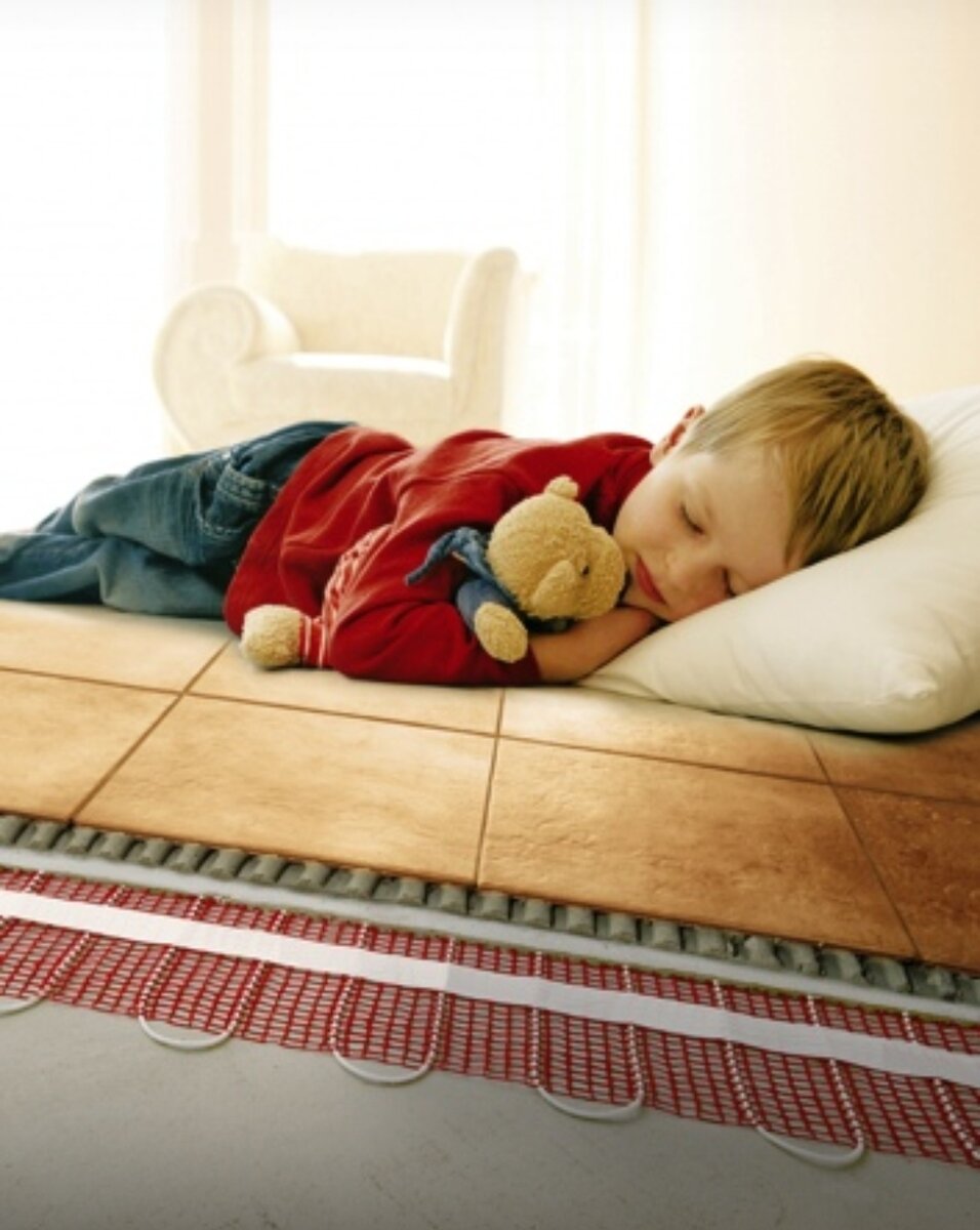 Греющий кабель или нагревательный мат укладывают только на ровную, чистую, обеспыленную поверхность пола. Таким образом, подготовка поверхности включает в себя устранение выступающих участков пола, заливку трещин, очистку от пыли. И, в идеале, нанесение грунтовки. Если поверхность неровная под теплый пол, следует сделать стяжку. Если время позволяет можно использовать бетонную стяжку, но дальнейшие работы будут продолжены только после полного высыхания поверхности. При ограниченном временном ресурсе и относительно ровной поверхности, можно отдать предпочтение наливным полам. Укладывать кабель на деревянный пол или фанеру нежелательно, это приведет к потерям тепла. Регулятор тепла устанавливается в предназначенном для него месте. Провод, который будет соединять регулятор и кабель укладывает в гофру. В свою очередь, гофра помещается в трубу и доводится до места расположения датчика. Датчик устанавливается на расстоянии 300-400 мм. от края стены между витками кабеля. Это дает возможность