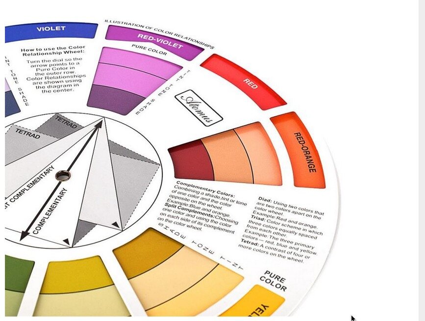 Сегодня хочу рассказать вам про своего верного помощника - цветовое колесо. Удивительно, как я забыла упомянуть о нем, когда писала о необходимых инструментах для лоскутного шитья! Исправляю ошибку; Цветовое колесо - это такое сооружение из картона, представляющее из себя несколько кругов, раскрашенных и скрепленных в середине . На одной стороне колеса по кругу даны базовые цвета (с градацией от яркого к темному) и стрелки-посказки. Они нужны для безошибочного выбора грамотного (гармоничного) сочетания цветов. Первый пример: Стрелка направлена на "красно-фиолетовый". Комплементарный (противоположный) к нему цвет - желто-зеленый. Как проверить? Смотрите сами: то же сочетание - в природе, оно же - у модных дизайнеров. Кому то может показаться ярковатым, но согляситесь - выглядит стильно; Идем дальше. Добавляем к основному цвету - красно-фиолетовому триаду - еще два цвета. лежащих в основании треугольника (вершина - красно-фиолетовый). Это - сине-зеленый и желто-оранжевый. Вуаля!