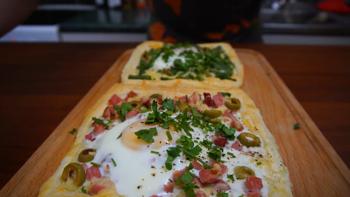 На одну часть из теста — выкладываем ветчину, оливки, сыр, а на вторую часть — зеленую фасоль, оливки, сыр. Отправляем в разогретую духовку до 200 градусов Цельсия на 10 минут.