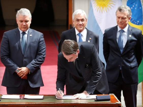 8 президентов южноамериканских стран собрались в Сантьяго, Чили, и подписали соглашение о создании нового регионального блока ПРОСУР. Новая политическая ассоциация получила второе название — "форум прогресса Южной Америки". Отличительной чертой организации станет то, что она "будет функционировать "без идеологии и бюрократии, но с полной приверженностью свободе, демократии и правам человека". ПРОСУР включает Бразилию, Аргентину, Чили, Парагвай, Колумбию, Эквадор, Перу и Гайану. В блоке будут обсуждать вопросы инфраструктуры, энергетики, безопасности, здравоохранения, обороны, преступности и реагирования на стихийные бедствия. "Здесь страны южной Америки могут обмениваться идеями, работать вместе и вместе добиваться большей свободы, интеграции и развития." Раньше в Южной Америке успешно функционировал блок УНАСУР. Его создали президент Венесуэлы Уго Чавес и бразильский президент Луис Инасио Лула да Силва в 2008 году. В то время большинство стран Южной Америки возглавлялись левыми прав