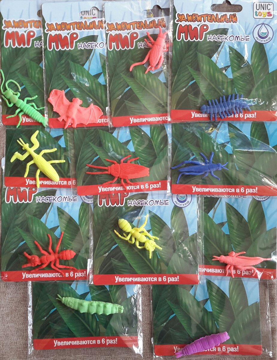 Очередные насекомые в коллекцию внука. В "Пятерочке " были с хорошей скидкой и заманчивым названием. Конечно, мимо не прошла. И прежде чем ему отдать, все-таки решила проверить достоверность информации, т.к. недавно приобрели такую игрушку, но другой фирмы и были не в восторге. Это была акула, которая после погружения в воду должна была увеличиться в 3 раза, но превратилась в какое-то жуткое желе с ужасным химическим запахом. В нашем комплекте оказалось 3 пары одинаковых насекомых. Только разного цвета. Производитель Китай. И одну пару мы оставляем для сравнения Следуем инструкции. Игрушка- антистресс из термопластичной резины. Распечатываем. На ощупь приятные, очень эластичные, едва уловимый запах резины. Нормальной формы. Очень даже похожи на настоящих насекомых, разве что цвет, но это же игрушки ! Погружаем в воду и ждем Первый результат через 12 часов Опять кладем в воду. И сравниваем через 24 часа И еще через 24 часа Очень хорошо видно , что насекомые увеличились, может и