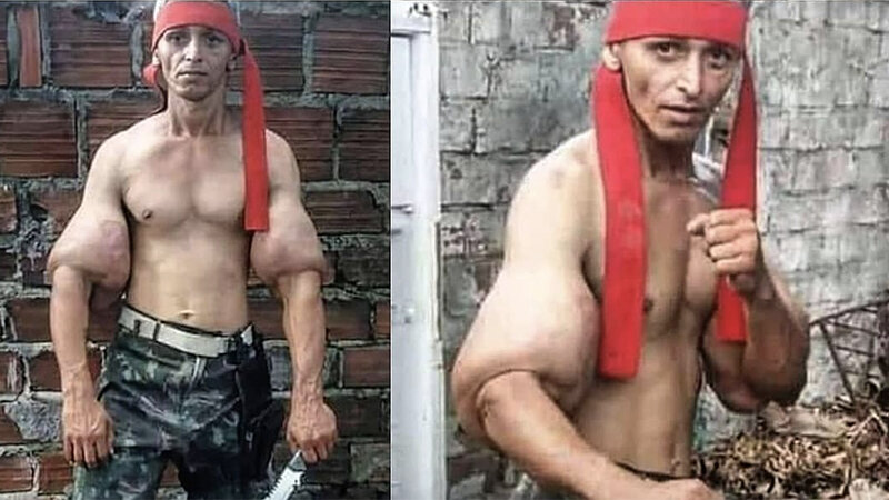 Синтольные фрики уже не являются для нас чем-то новым, такие ка легендарный Грегг Валентино и его «взрывающиеся руки», затем бразилец Родриго и его сумасшедший Синтол Гейнц и больные танцевальные движения. Современный фитнес-миссия, Рич Пиана, который, хотя и не злоупотреблял синтетическими маслами, признавался в том, что использовал их пару раз. Поэтому неудивительно, что еще один «атлет», усиленный маслами, привлек к себе внимание социальных сетей, своими ужасно надутыми руками. Еще неопознанного человека называют «Синтольный Рэмбо» не из-за его странного сходства с молодым Сильвестром Сталлоне, а из-за его камуфляжных штанов и красной повязки. Как вы можете видеть на фото выше, бицепсы этого человека практически тают. Теперь это гигантские мешки воспаления и инфекции, которые ужасно свисают с его рук. Было бы легко издеваться над этим парнем и делать саркастические комментарии о его гигантских руках, но давайте будем гуманистами. Это болезнь, ужасная болезнь, которая в конечном ит