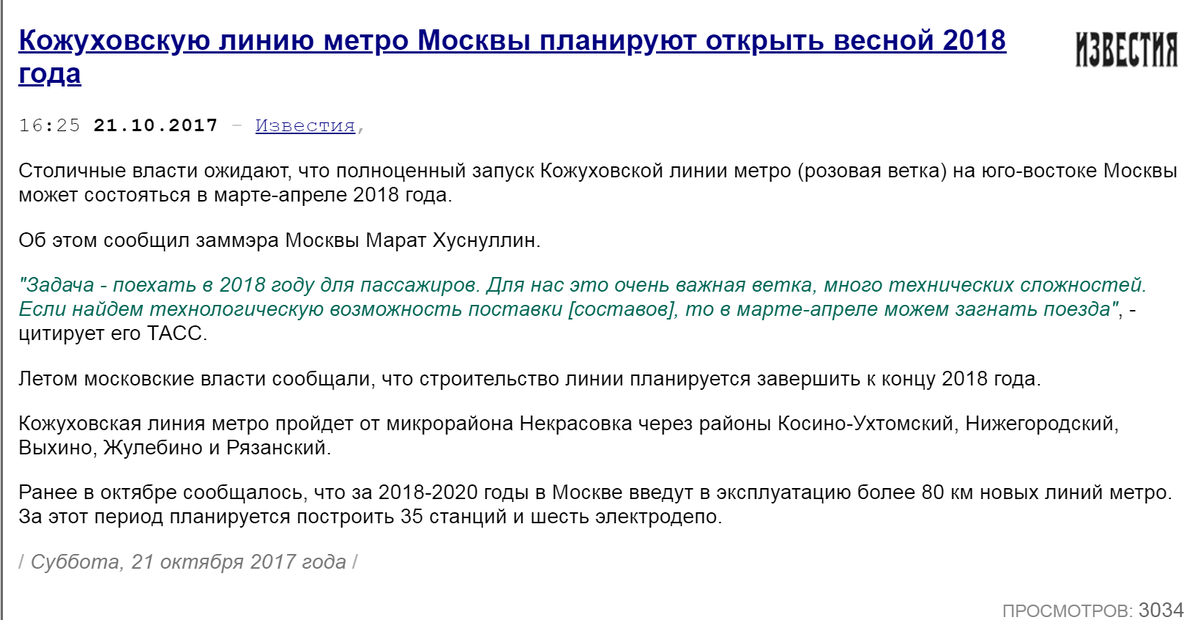 Хорошо, что интернет все помнит и находит. Сначала Кожуховскую линию метро Москвы планировали открыть весной 2018 года.
