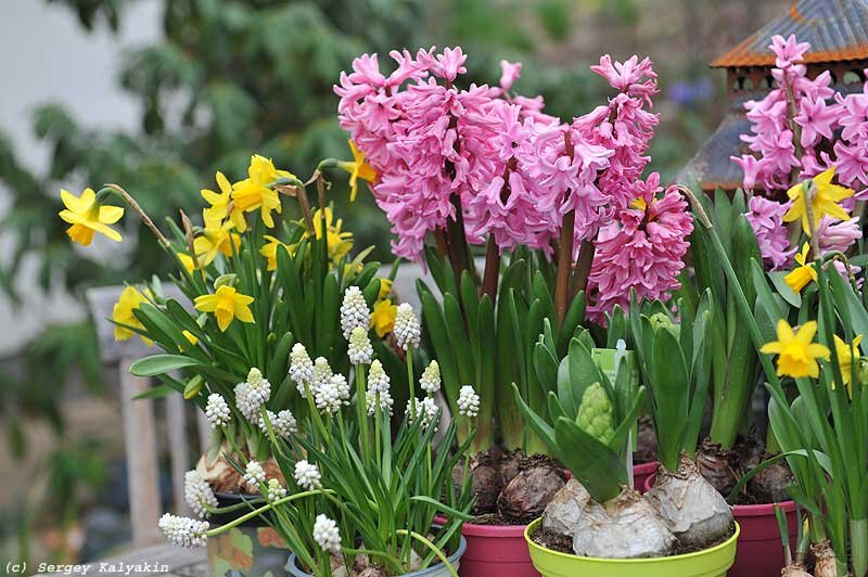 Цветут мускари, хионодоксы, гиацинты, нарциссы и самые ранние тюльпаны, распустилась листва роз, клематисы - в бутонах. К моей полянке красивого двухцветного мускари широколистного добавились ботанические тюльпаны Persian Pearl. Другая цветущая полянка - под японским кленом: синяя анемона нежная и печоночница. А полянку мускари армянского через месяц сменит поляна нектароскордума. Цветут хионодокса Форбса и хионодокса Люцилии Pink Giant. Она вместе с нарциссом Dick Wilden и белым мускари - на сегодняшний день любимое лакомство мелких жуков-цветоедов. Гиацинты в самом расцвете. Они у меня в основном из тех, что поселились в саду после выгонки. Что еще цветет? Бадан Bressingham White с белыми цветками, мохнатый прострел, доцветает синтирис миссурийский. Уже выбросили цветоносы аквилегии, готовятся цвести джефферсония сомнительная (какая окраска листвы!) и джефферсония двулистная, а также подофилл Spotty Dotty. Стоит уже в бутонах клематис Diamantina. Из декоративнолистных отмечу весенн