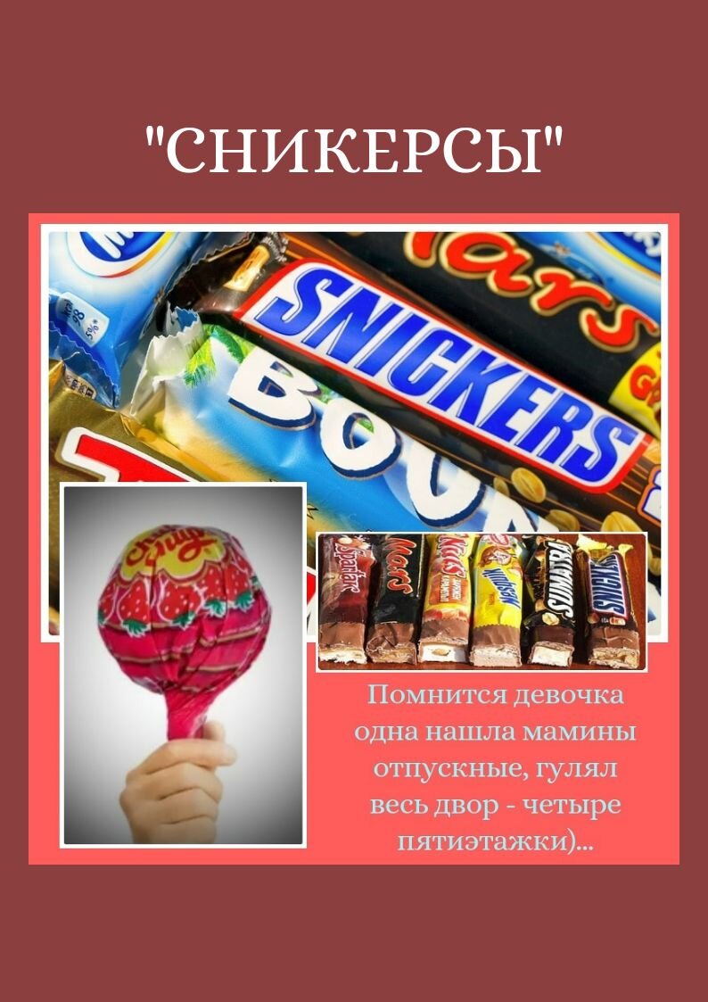 Помнится девочка одна лет восьми-девяти нашла мамины отпускные. "Мелочь" из четырёх пятиэтажек гуляла до вечера).... Реальная история. Жива)... Это было в маленьком северном городке в 93-м или 94-м году. Пока взрослые заметили и спохватились, запас батончиков в десятке окрестных киосков был уничтожен. Вот такой вот праздник жизни. Сейчас, оглядываясь, кажется, что мы все довольно быстро накушались этой ерунды. А тогда эти сладости были яркой заметной жизненной этикеткой. У одного моего приятеля, вполне взрослого дяденьки, даже было прозвище "Сникерс"...)