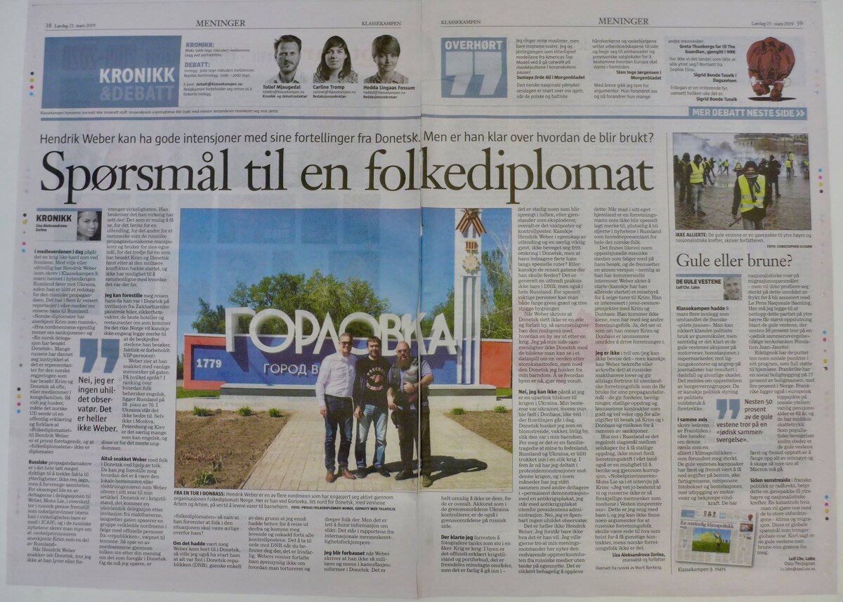 В ответ на мою статью о Донецке он написал в Klassekampen, что всё написанное мной — ерунда, никаких военных в Донецке нет, город оживлённый, мирный, люди — счастливые и смотрят на будущее с оптимизмом.