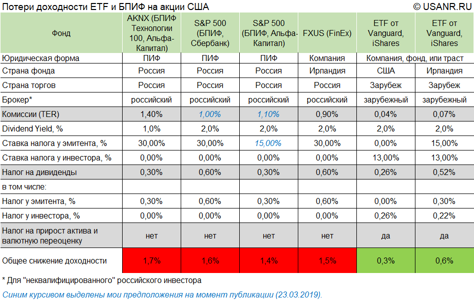 Продолжаю тему индексных фондов для российского инвестора. Сегодня буду разбирать новые БПИФ на фондовые индексы США. БПИФ S&P 500 от Сбербанка — плохая идея На днях российский Центробанк зарегистрировал БПИФ S&P 500 от Сбербанка. Сбербанк дал следующий комментарий для СМИ о содержании базового актива БПИФ: «это акции, входящие в индекс S&P 500, то есть компания будет самостоятельно собирать корзину с бумагами». Если это так, то инвестора в этот БПИФ ждут одни неприятности, а именно потеря годовой доходности на уровне 1,6% и выше. Все дело в американском налоге на дивиденды. Как вы помните российский ПИФ (в том числе БПИФ) не является ни юридическим лицом, ни налогоплательщиком. То, что было преимуществом для вложения в российские акции становится недостатком для вложения в зарубежные фондовые индексы. Зарубежные эмитенты удерживают налоги на дивиденды и проценты по повышенным ставкам, если получатель дивидендов не подтвердил свое право на применение льготной ставки по соглашению об