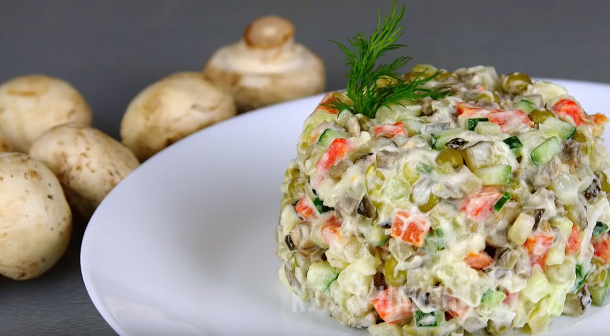 Салат очень вкусный и легкий. И готовлю я его не только в пост. Попробуйте - вкусно)) Вместо мяса или колбасы я беру шампиньоны. Нарезаю их мелко и обжариваю на небольшом количестве растительно масла. Затем даю остыть. Остальные овощи нарезаю на одинаковые кубики. Лук можно залить кипятком или замариновать. Но если лук сладкий попадается, я этого не делаю. Как я готовлю этот салат, смотрите в видео ниже на 04:21. Там же еще 4 рецепта салата "Оливье". Посмотрите - вам понравится)) Складываю нарезанные овощи в миску, добавляю остывшие грибы и зеленый горошек. Заправляю постным майонезом. Два рецепта постного майонеза я уже показывала ЗДЕСЬ. Ингредиенты: