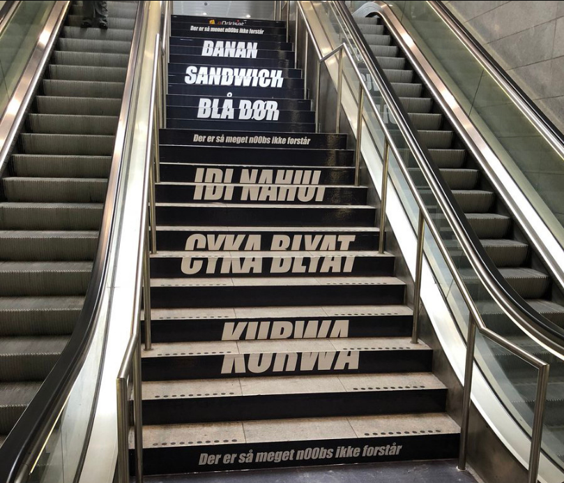 В столицы Дании, Копенгагене, в одном из метрополитенов красуются надписи интересного содержания. Давайте разберемся кому они адресованы и кем сделаны. С первого взгляда подобные надписи могут показаться нечем иным, как банальным актом вандализма, но это не так. Эти надписи разместила Датская букмекерская контора Oddset. Именно её сотрудники написали на ступенях те слова, что вы видите на фото. Значение некоторых из них вам, наверняка, известно. К вопросу о том, что они там делают. Все очень просто — это часть рекламной компании «Der er så meget n00bs ikke forstår», что дословно значит, «так много нубов этого не поймут». В данном случае идет отсылка ко, всем известному шутеру Counter-Strike. Слово «Bnan», в этом контексте, обозначает определенную область на одной из карт CS (Counter-Strike). Все остальные надписи являются частыми выкриками самих игроков восточной Европы, в процессе игры. Мне эта рекламная акция кажется, как минимум, интересным способом привлечения внимания. А как